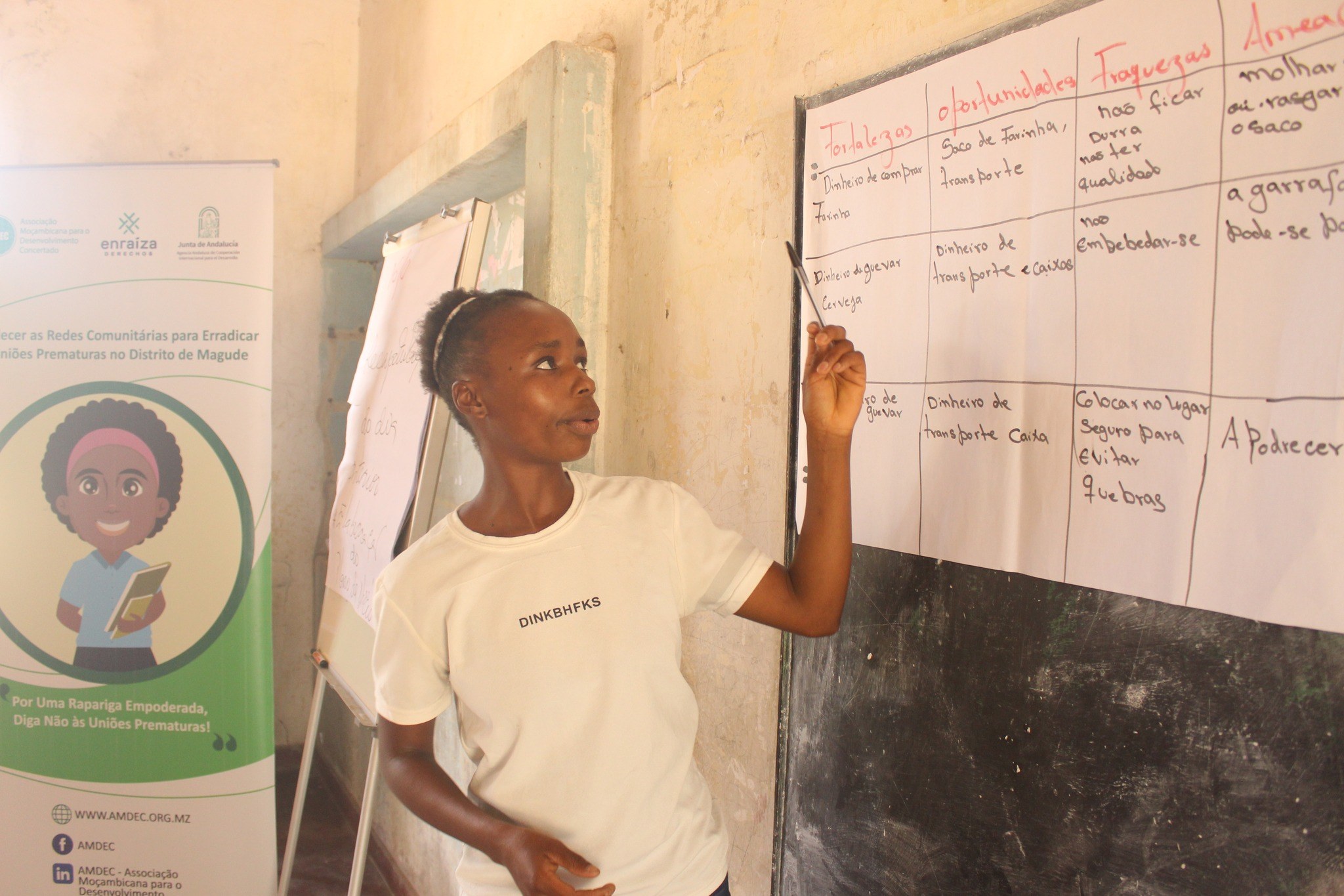 AMDEC capacitar 60 raparigas e mulheres jovens vulneráveis, do distrito de Magude, em habilidades e conhecimentos necessários paro desenvolvimento de actividades geradoras de renda, visando o seu empoderamento econômico e a melhoria das condições de vida. A acção insere-se no projeto “Fortalecer as redes comunitárias para erradicar as uniões prematuras no Distrito de Magude”.
